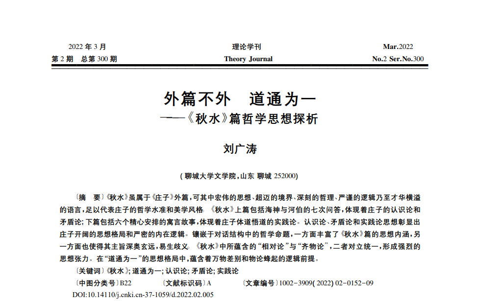 近日,公司刘广涛老师的论文《外篇不外 道通为一——<秋水>篇哲学思想探析》刊发于《理论学刊》2022年第2期。