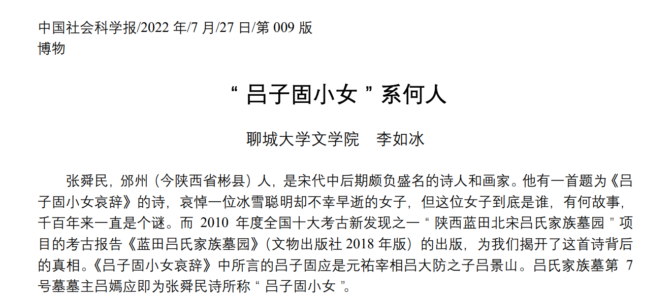论文以严谨的逻辑、细致的考辨确定了2010年全国十大考古发现之一“陕西蓝田北宋吕氏家族墓园”第7号墓墓主吕嫣即北宋诗人张舜民所撰《吕子固小女哀辞》一诗中的“吕子固小女”,揭开了近千年来困扰读者的“吕子固小女”身份之谜及其背后故事,观点新颖,结论可靠,显示出李如冰老师扎实的文献功底及良好的学术素养。此文曾在2021年公司与复旦大学出土文献与古文字研究中心联合主办的“第八届出土文献与中国文学研究学术研讨会”提交并获得热烈反响,得到北京大学董珊教授、公司特聘教授姚小鸥、季旭昇等著名学者的高度评价。此文在《中国社会科学报》的发表体现了学术界对这一成果价值的认可与肯定。