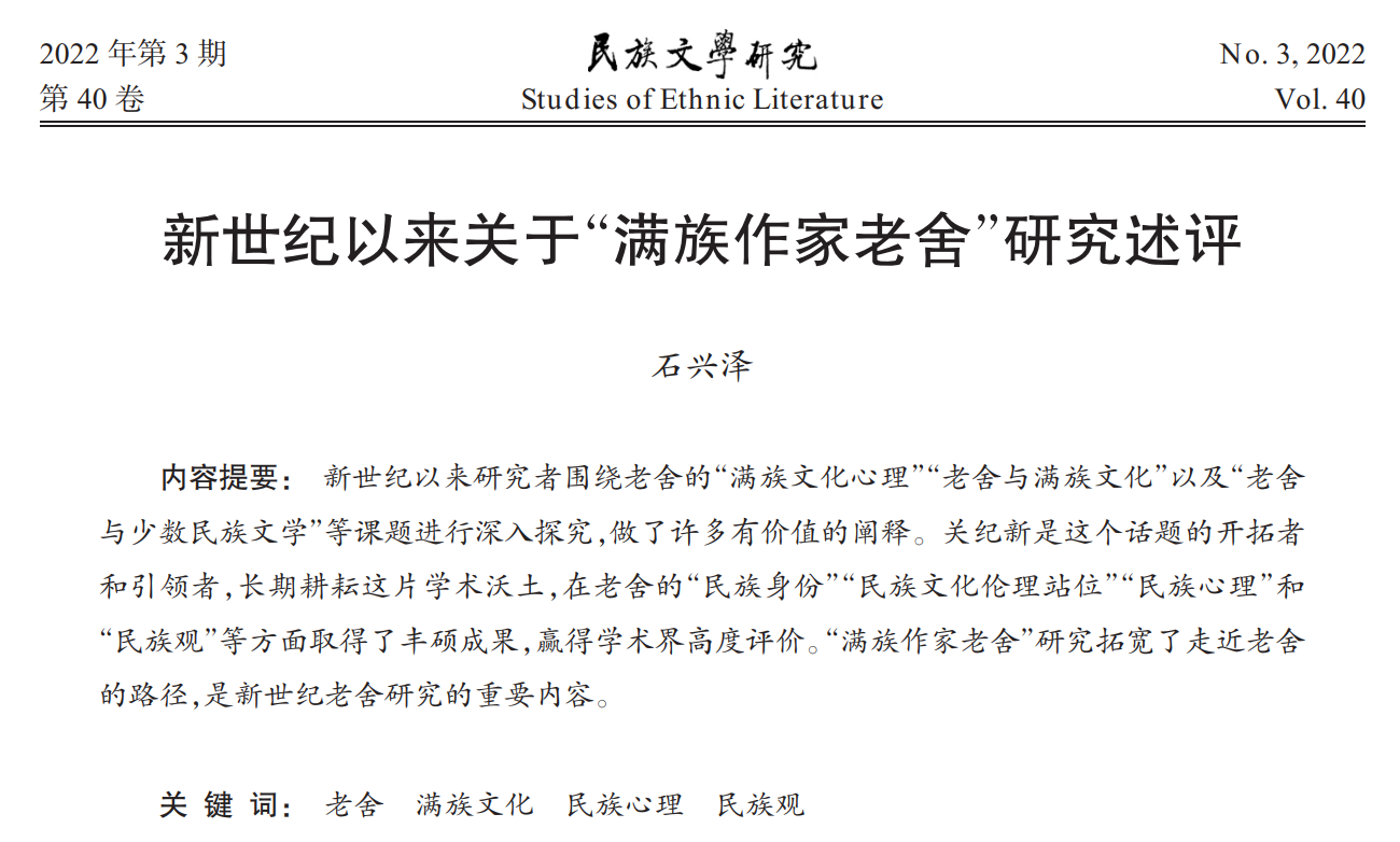 近日,公司石兴泽老师的论文《新世纪以来关于“满族作家老舍”研究述评》刊发于《民族文学研究》2022年第3期。