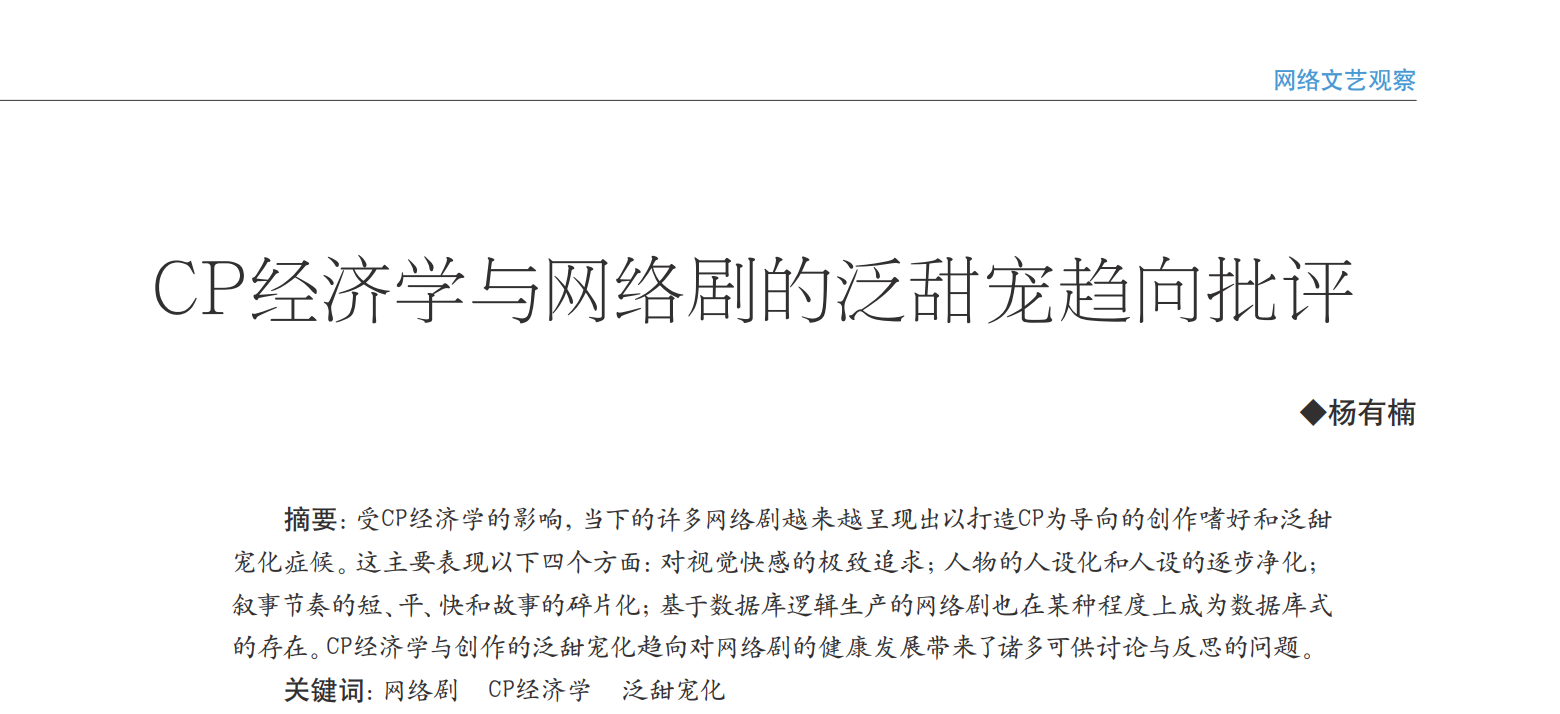 近日,公司杨有楠老师的论文《CP经济学与网络剧的泛甜宠趋向批评》刊发于《当代电视》2022年第7期。