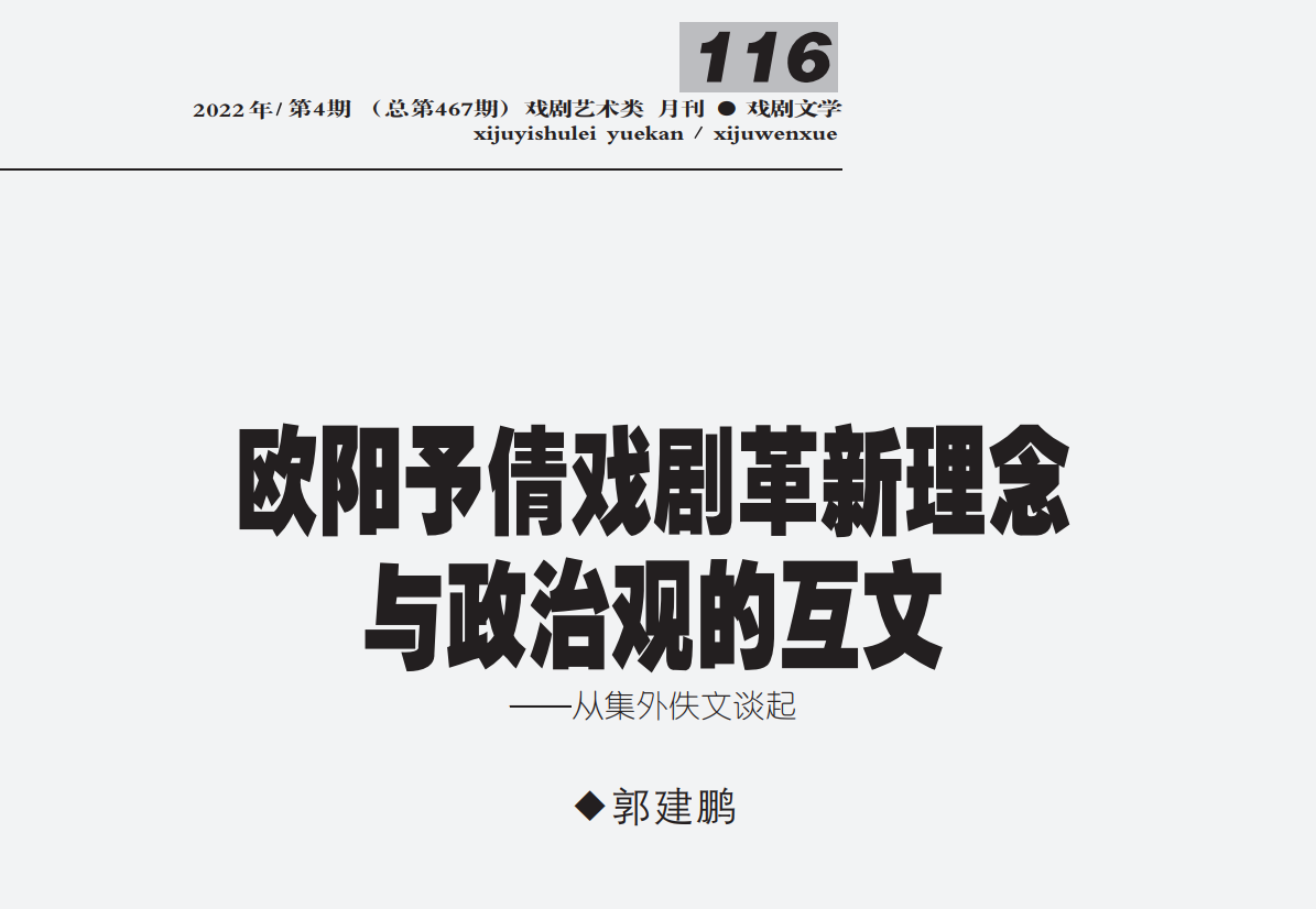 近日,公司郭建鹏老师的论文《欧阳予倩戏剧革新理念与政治观的互文 ——从集外佚文谈》刊发于《戏剧文学》2022年第4期。