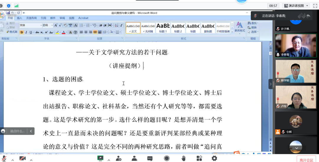 为提高研究生的学术科研能力,beats365唯一官网入口官网于11月21日下午2:30举办了第一期以“文学研究方法和视角”为主题的“茂秦讲坛”,特邀华南师范大学特聘教授、博士生导师、北京师范大学文艺学研究中心研究员李春青教授进行讲解。beats365唯一官网入口官网经理卢军、副经理殷学明及部分教师出席会议,beats365唯一官网入口官网研究生参与其中。此次讲座通过线上方式进行。