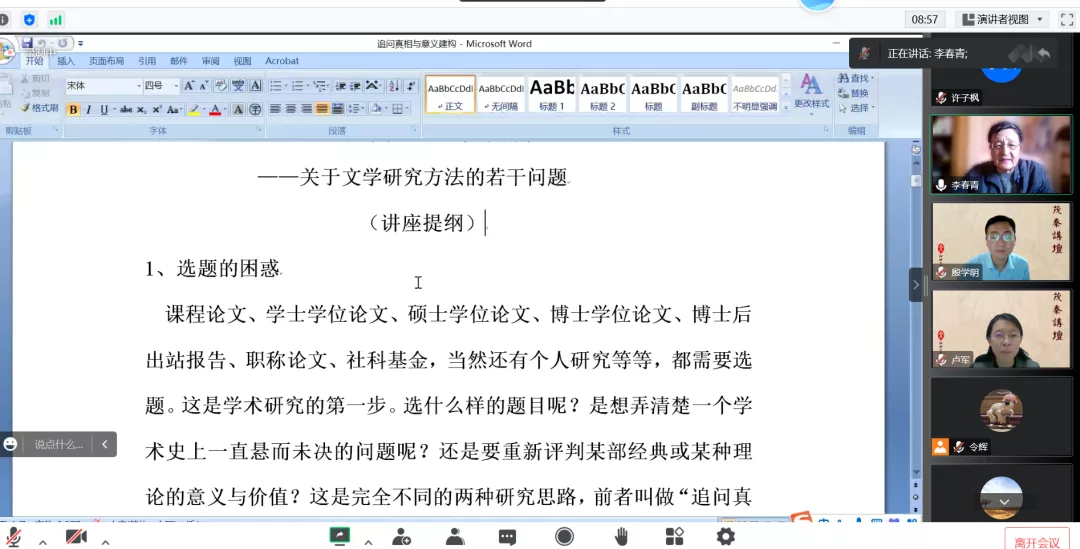 为提高教师与研究生的学术科研能力,11月21日,beats365唯一官网入口官网于线上举办“聊大讲坛”活动,华南师范大学特聘教授、博士生导师、北京师范大学文艺学研究中心研究员李春青教授应邀做客“聊大讲坛”,作“文学研究方法和视角”为主题的学术报告。beats365唯一官网入口官网经理卢军、副经理殷学明及部分教师出席会议,beats365唯一官网入口官网研究生参与其中。