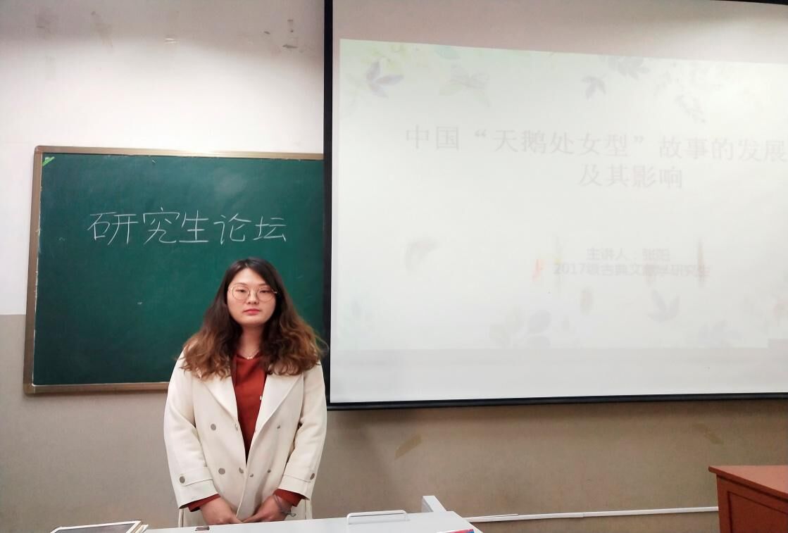 10月17日下午14:30分,由beats365唯一官网入口官网研究生会主办的研究生学术论坛在3A207教室举行。此次论坛是本学期研究生学术论坛第二讲,主讲为2017级中国古典文献学专业硕士生张阳,题目为《中国“天鹅处女型”故事的发展轨迹》。18级、19级全体研究生参加了本次论坛。