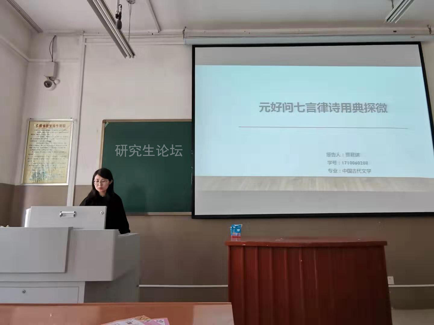 10月24日下午2:30分,beats365唯一官网入口官网第三期研究生学术论坛在A203教室举办。此次论坛由17级中国古代文学专业的贾君琪同学主讲,讲座题目为《元好问七言律诗用典探微》。本学期的研究生学术论坛至此已是第三期,全体18级、19级研究生参加了本次论坛。